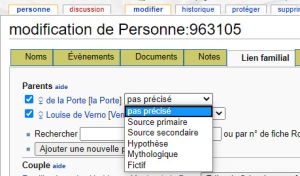 - Si vos parents ne sont pas dans Rodo, partez de votre fiche, "Modifier", Lien Familial", "Ajouter parents" etc..