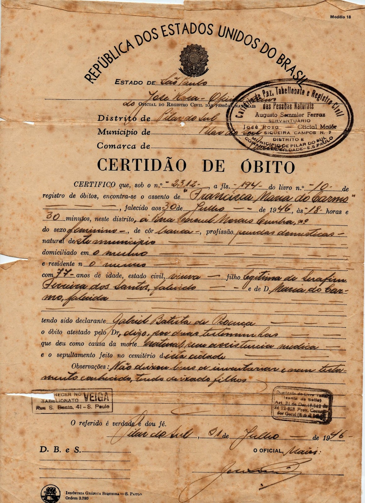 30 juillet 1946 décès: Pilar do Sul, SP, Brasil, https://3.bp.blogspot.com/-A9hIiqZ7RKE/WJvIcungejI/AAAAAAAACMc/wdEx3GjaK5EcWfWFpjg95NYf2w6aAQfNwCPcBGAYYCw/s1600/obito%2Bfrancisca%2Bma%2Bcarmo.jpg